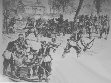 Before leaving Providence Gorton had written a lengthy and highly critical letter to Massachusetts, attacking their government and intolerant religious practices, and refusing to obey summonses to the Boston court. Until Roger Williams returned with the patent, Gorton told them, the only colonial government recognised in Shawomet was that agreed amongst its own inhabitants. The following year, after months of suffering at Shawomet, having recently learned of the fate of their friends the Hutchinsons on Long Island, and on the day another cow returned with arrows piercing its sides, a second letter was sent to Boston. Containing the often quoted lines “If you present a gun, make haste to give first fire: for we are come to put fire on the earth, and it is our desire to have it speedily kindled”, this letter provided the image of Samuel Gorton as the “dangerous firebrand” he is often represented to be. But, although containing another attack on Massachusetts’s integrity, the letter was an understandable response to the frustration, deprivation and stark terror being endured in Shawomet, and was in fact written by Randal Holden. It is often cited in mitigation of Massachusetts’s actions in sending a band of forty musketeers “and many Indians” to sieze the “dangerous incendiary” Samuel Gorton dead or alive. However, Massachusetts had not received the letter when despatching its forces.