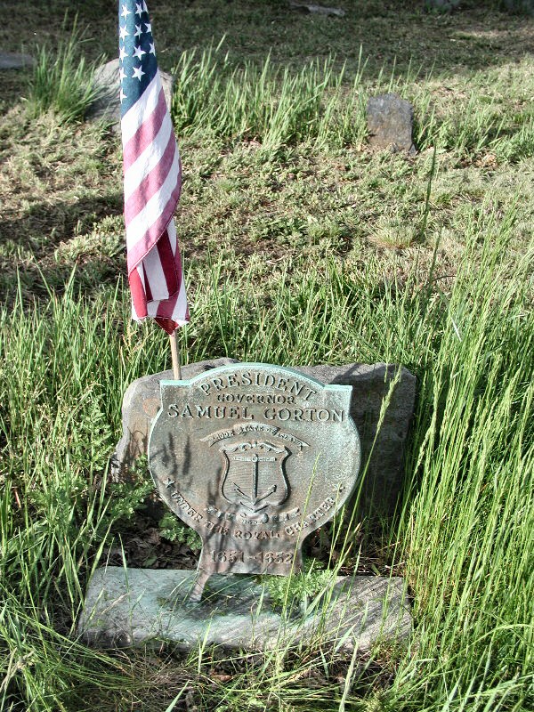 Gorton died on the 10th of December in 1677, and his grave is visible behind a private home, on Samuel Gorton Avenue off Warwick Neck Road in Warwick, Rhode Island. However, the grave aforementioned is that of one of Samuel’s descendants. Scholars agree that we actually do not know where he was buried, but there is a small memorial park with a bench, stone, and plaque commemorating the place where his homestead once stood on Warwick Neck Ave. in Warwick. Samuel’s homestead along with the rest of Warwick was burned to the ground during King Philip’s War.