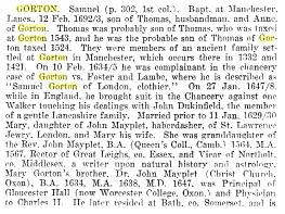 GORTON, Samuel (p. 302, 1st col.). Bapt. at Manchester, Lancs, 12 Feb. 1692/3, son of Thomas, husbandman, and Anne of Gorton. Thomas was probably son of Thomas, who was taxed at Gorton 1543, and he was the probable son of Thomas of Gorton taxed 1524. They were members of an ancient family settled at Gorton in Manchester, which occurs there in 1332 and 1421. On 10 Feb. 1634/5 he was complainant in the Chancery case of Gorton vs Foster and Lambe, where he is described as “Samuel Gorton of London, clothier.” On 27 Jan. 1647/8, while in England, he brought suit in the Chancery against one walker touching his feelings John Dukinfield, the member of a gentle Lancashire family. Prior to 11 Jan 1629/30 Mary, daughter of John Mayplet, haberdasher, of St. Lawrence Jewry, London, and Mary his wife. She was granddaughter of the Rev. John Mayplet, B.A. (Queen’s Coll., Chamb.) 1564. M.A. 1567. Rector of Great Leighs, en. Essex, and Vicar of Northolt, co. Middlesex, a writer upon natural history and astrology. Mary Gorton’s brother, Dr. John Mayplet (Christ Church, Oxon), B.A., 1634, M.A. 1638, M.D. 1647, was Principal of Gloucester Hall (now Worcester College, Oxon.) and Physician to Charles II. He later resided at Bath, co. Somerset, and is buried in the Abbey Church there with a tablet to his memory. (New Eng. Hist. & Gen. Reg., Vol. 82, pp. 185-3, 333-42; Vol. 70, p. 115.) Samuel was a volunteer for the Pequot War from Plymouth.