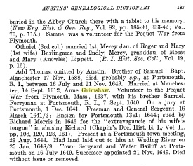 Add Thomas, omitted by Austin. Brother of Samuel. Bapt. Manchester 17 Nov 1588,m died, probably s.p., at Portsmouth, R.I. between 16 July and 21 Nov. 1649. Married at Manchester, 14 Sept. 1612, Anne Grimshaw. Volunteer to the Pequot War from Plymouth Mass., 1637, with his borther Samuel. Ferryman at Portsmouth, R.I., 7 Sept. 1640. On a jury at Portsmouth, 1 Dec. 1641. Freeman and General Sergeant, 16 March 1641/2; Ensign for Portsmouth 13:1:1644; sued by Richard Morris in 1646 for the “extravagancie of his wife’s tongue” in abusing Richard (Chapin’s Doc. Hist. R.I., Vol II, pp. 108, 120, 128, 161). Present at a Portsmouth town meeting, 29 Aug. 1644. Had land laid out to him at Wading River on 25 Ja. 1648/9. Town Sergeant and Water Bailiff at Portsmouth on 16 July 1649. Successor appointed 21 Nov. 1649. Died without issue or removed.