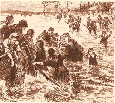 Probably at the instigation of those authorities Ralph Smith, to whom Smith was beholding for allowing him to retain his large house when replaced in the ministry, now attempted to withdraw the Gorton lease. When Samuel resorted to mutually agreed arbitration private papers were confiscated by Governor Thomas Prence. Then, a maid in the Gorton household was threatened with deportation for “smiling in congregation” and Samuel appeared on her behalf, only to find himself defending his lease. He challenged the court for abusing procedure and appealed to the people to “stand for your liberty”. For this he was accused of “sedition” and “mutiny”, fined £20 and banished. But the deputies of the court protested against both the sentence and the conduct of the magistrates, particularly in their refusal to allow them the vote on the question of Gorton’s guilt. Nine refused to attend the next sitting of the court and seven were fined 3 shillings as many as three times for continuing their protest. The Gortons were turned out of their home at the height of the worst blizzard so far experienced by the New England settlers. John Winthrop recorded at the time: “Five men and youths perished between Mattapan and Dorchester, and a man and a woman between Boston and Roxbury”. The women and children were taken in by friends but Samuel, Thomas and John Wickes were forced out into the wilderness, through knee-deep snow with several rivers to cross.