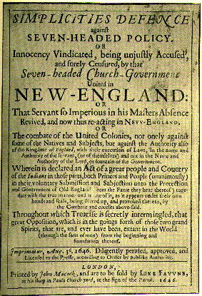 Samuel decided to rid himself of the yolk of the Massachusetts Magistrates once and for all. He headed to England, but had to detour through the New York area, since he was still a wanted man in Massachusetts. He left his family for three years and sailed to England and presented his written manuscript, “Simplicities Defense Against a Seven Headed Policy,” London, 1649 (a copy of this is in the U.S. Library of Congress).