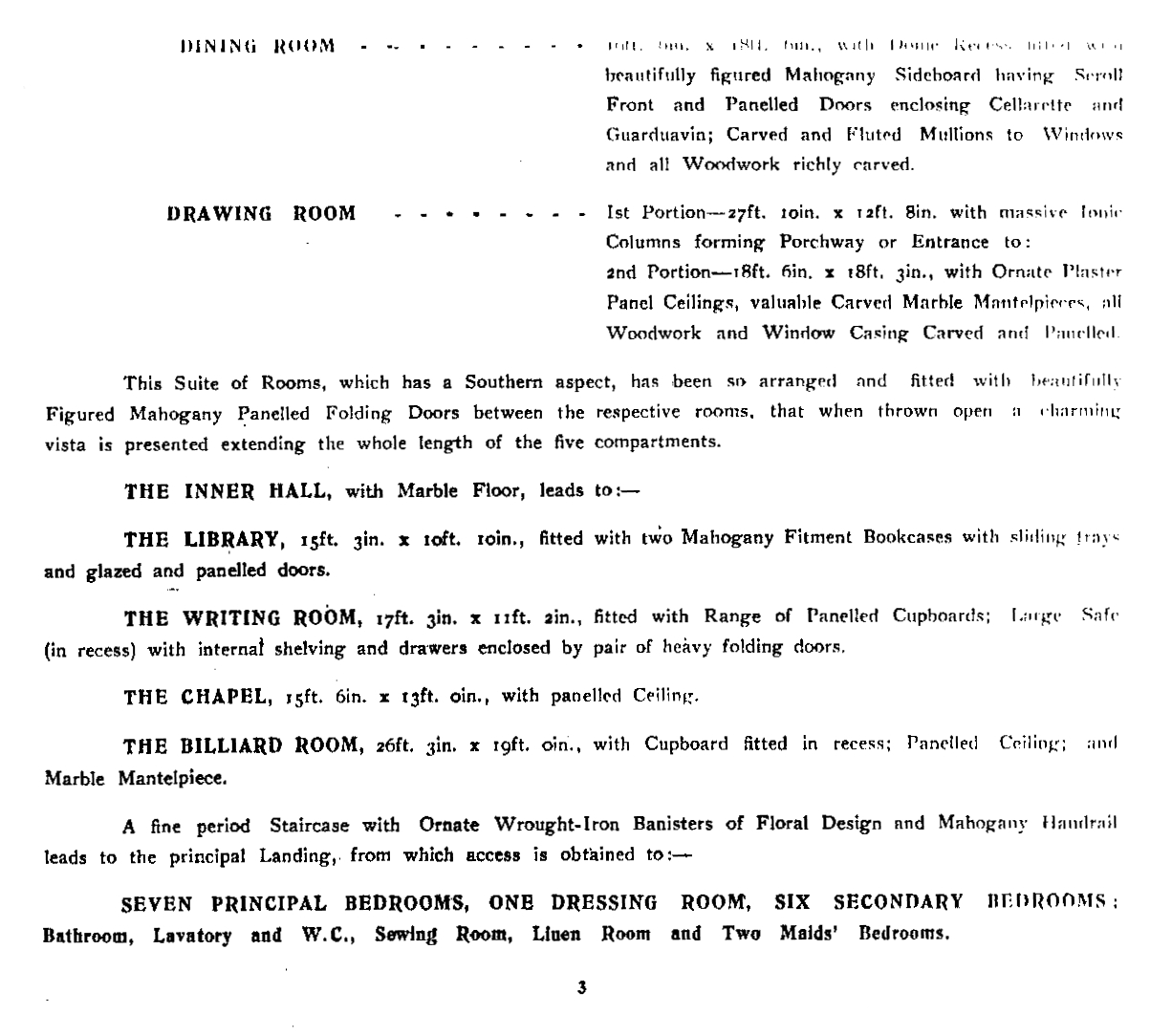 The south front is described with the following caption: “Style of S-Front — classical, consists of centre, containing the entrance hall and part of the drawing room and two wings containing the ante-room and dining [to the east] and the rest of the drawing room to the west respectively. Two wings run back northward from the south front, the western one containing the library & study. The eastern one containing the kitchen and other offices.