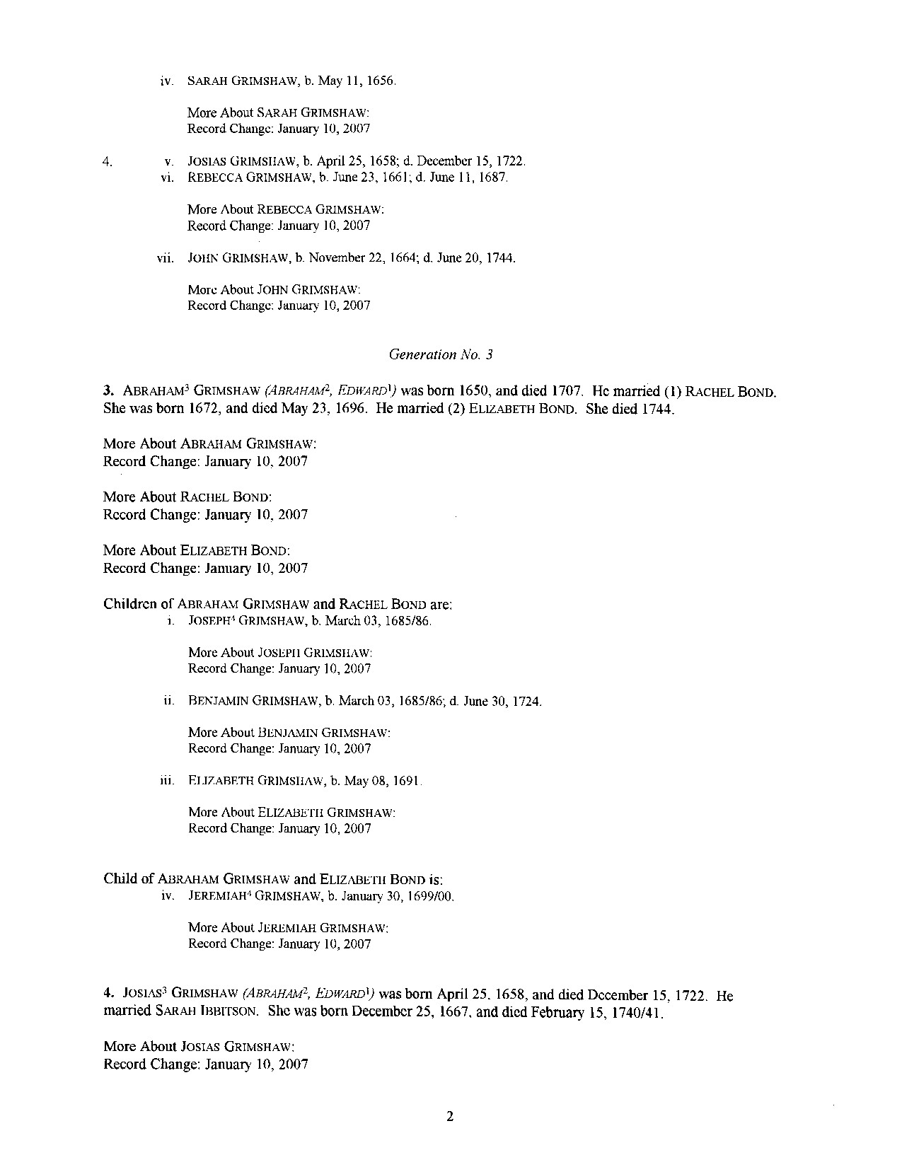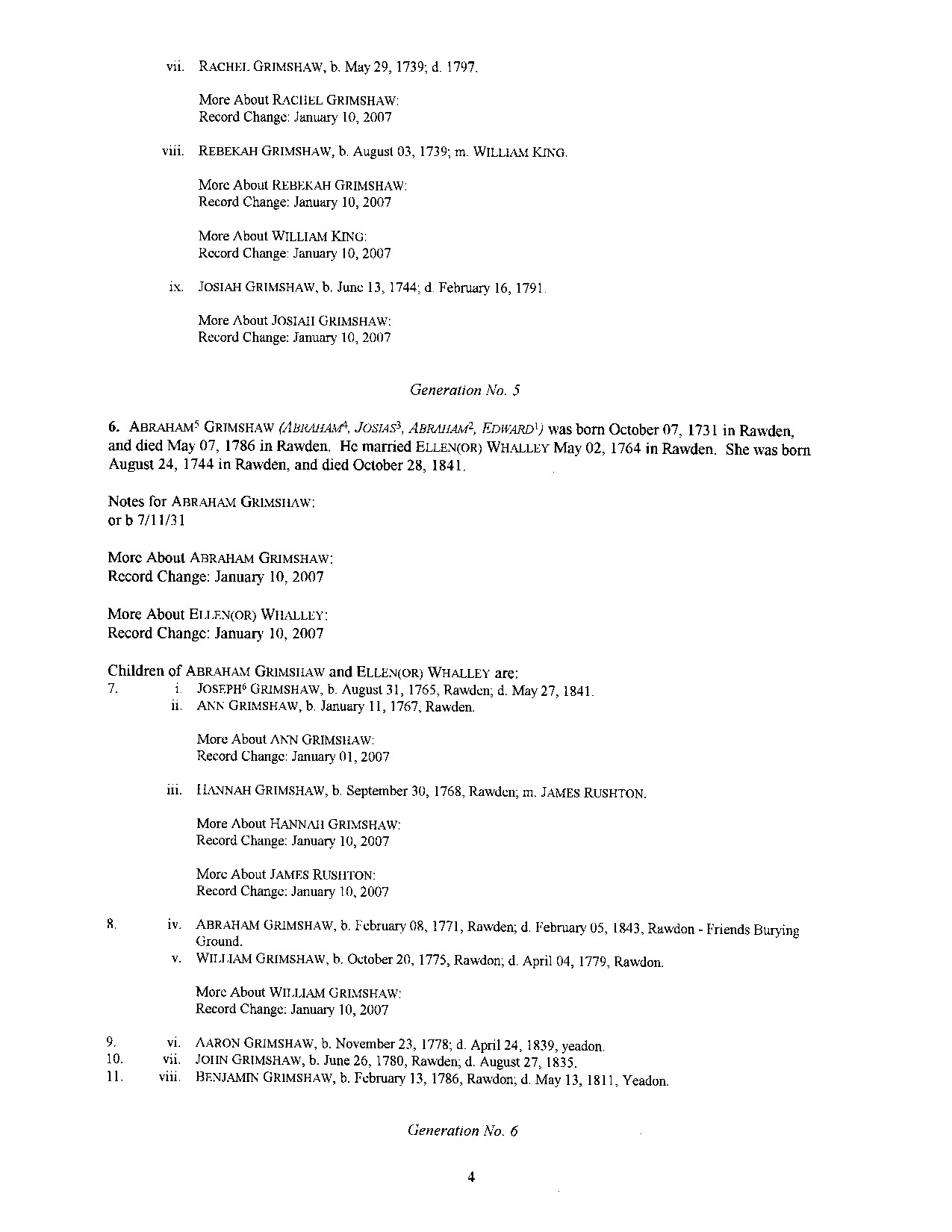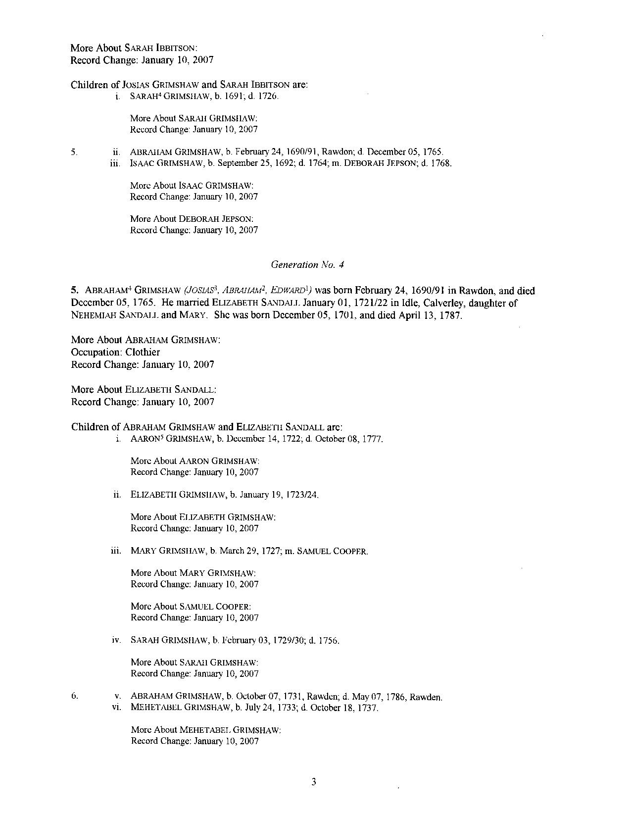 The GEDCOM file provided by Dave Hargreaves contains considerable additional detail on the descendants of Edward and Dorothy, with emphasis on Charles and Eliza Grimshaw. The descendant report has been scanned as a PDF file and can be accessed by clicking on the following: