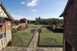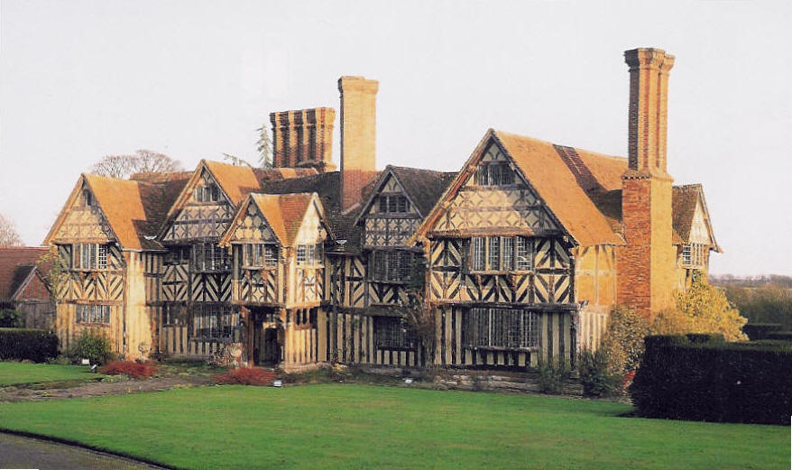 FEATURES OF NOTE. The house, which faces east, has a projecting porch and two projecting wings. The porch-gables face three ways, and by the side of the porch is a picturesque mounting block. The beautiful patterns of the timbers of the three storeys vary in design; some are straight, some placed diagonally, some form curves and circles, giving to the whole an effect of wonderful richness. The brick-filled eastern side facing the terraced garden and a stretch of water, though plainer, is charming; here, too, an old dove-cote comes in sight. The fluted brick chimneys give an admirable touch.