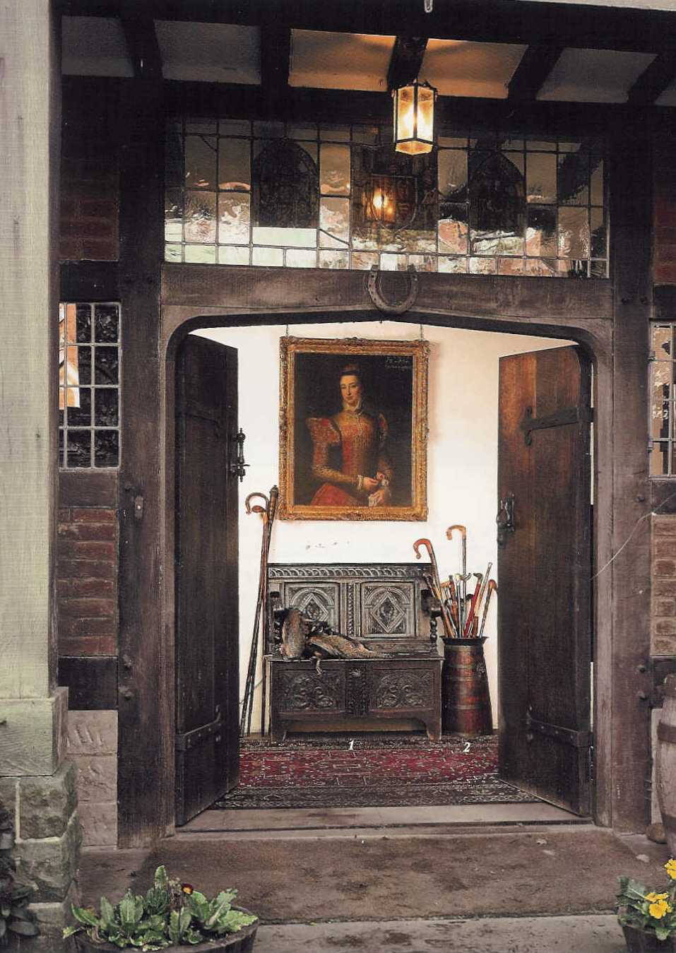 The interior is made up of a succession of charming panelled and halftimbered rooms with low ceilings and open fireplaces. An oak staircase, a massive piece of country craftsmanship, rises through the south wing.
