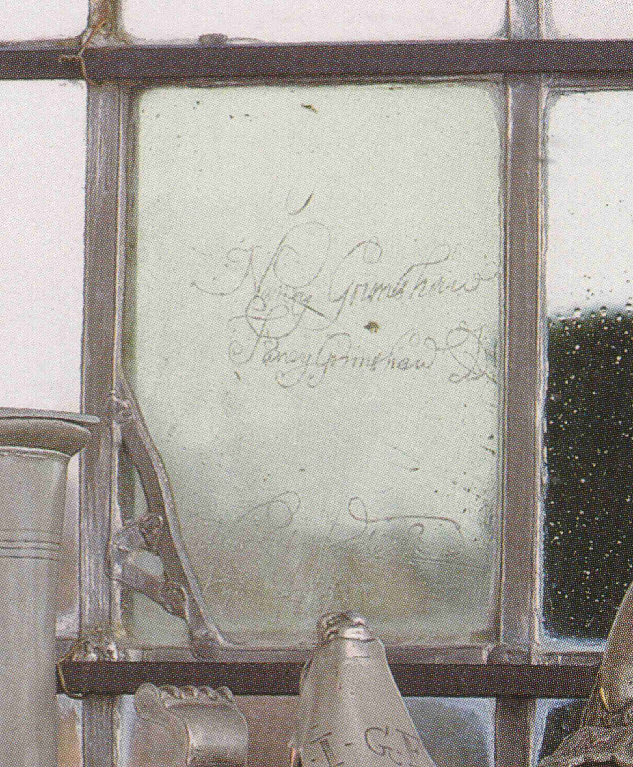 Figure 2. Image of Nancy and Fanny Grimshaw’s names scratched on a window of Grimshaw. As noted above, the complete inscription reads “Nancy Grimshaw, Fanny Grimshaw, My gray has got ye day”. From page 27 of Christie’s catalogue.