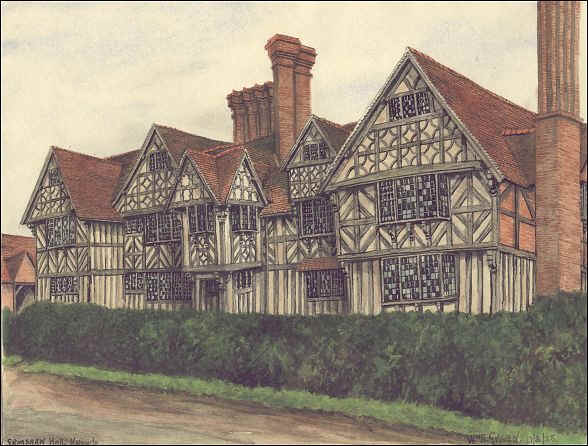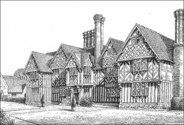 The Hall is about half a mile East of Knowle on the Hampton Road and is a beautiful example of Elizabethan domestic architecture. It has a main hall‑block between two cross‑wings which project forwards about six feet; in the centre is a fine two-storeyed porch, which completes the E plan often favoured at that time. The porch has a balustered entrance with carved brackets; the front door is old as are the iron drop‑knocker and the ornamental iron plate. The house consists of two storeys and attics and many gables, of which no two are exactly alike in shape or size except those above the porch. The chimneys are in three graceful groups – again all different.