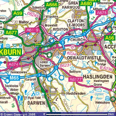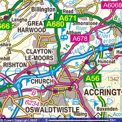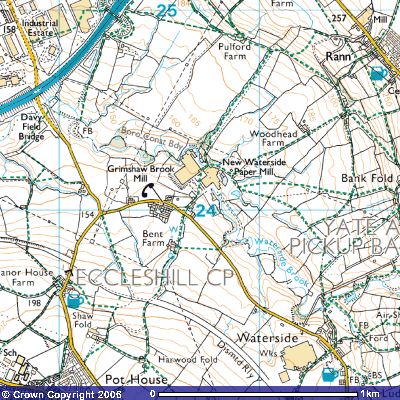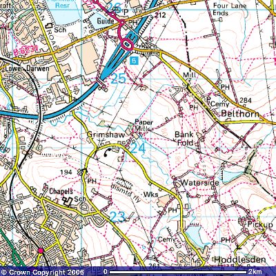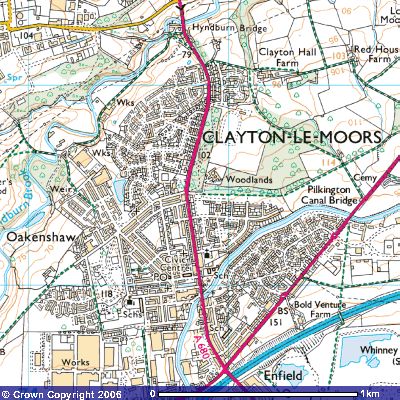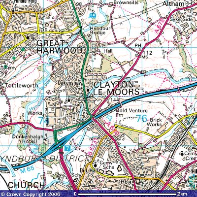 Both the Grimshaw and the Clayton-le-Moors locations are shown on the (British) Ordnance Survey map1 for the area (see Figure 1 below). The upper arrow on the map indicates Clayton-le-Moors, and the lower arrow shows the Grimshaw site.