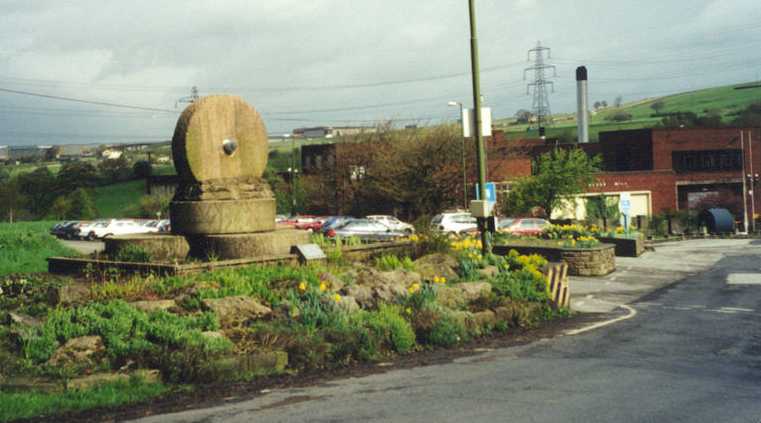 Figure 3. The “Kollergang Stone”, which is located at the entrance to the site. Note Grimshaw Brook Mill and paper-making cylinder of upper photo on the right side of this photo. This photo can also be compared with the picture of the Grimshaw site taken from Belthorn – the smokestack and the Kollergang stone can be seen in both photos if you look carefully. Photo taken westward, in March 1999.