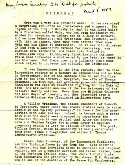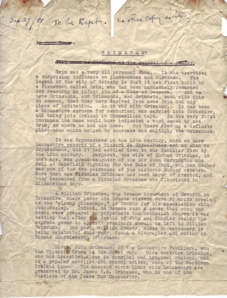 A document describing the Grimshaw surname and selected noteworthy Grimshaws was prepared by a member of the Crowtrees family line. The document, shown below, is dated September 27, 1951 and was provided by Stephanie (Grimshaw) Leon, a great-granddaughter of Thomas and Mary (Garde) Grimshaw.