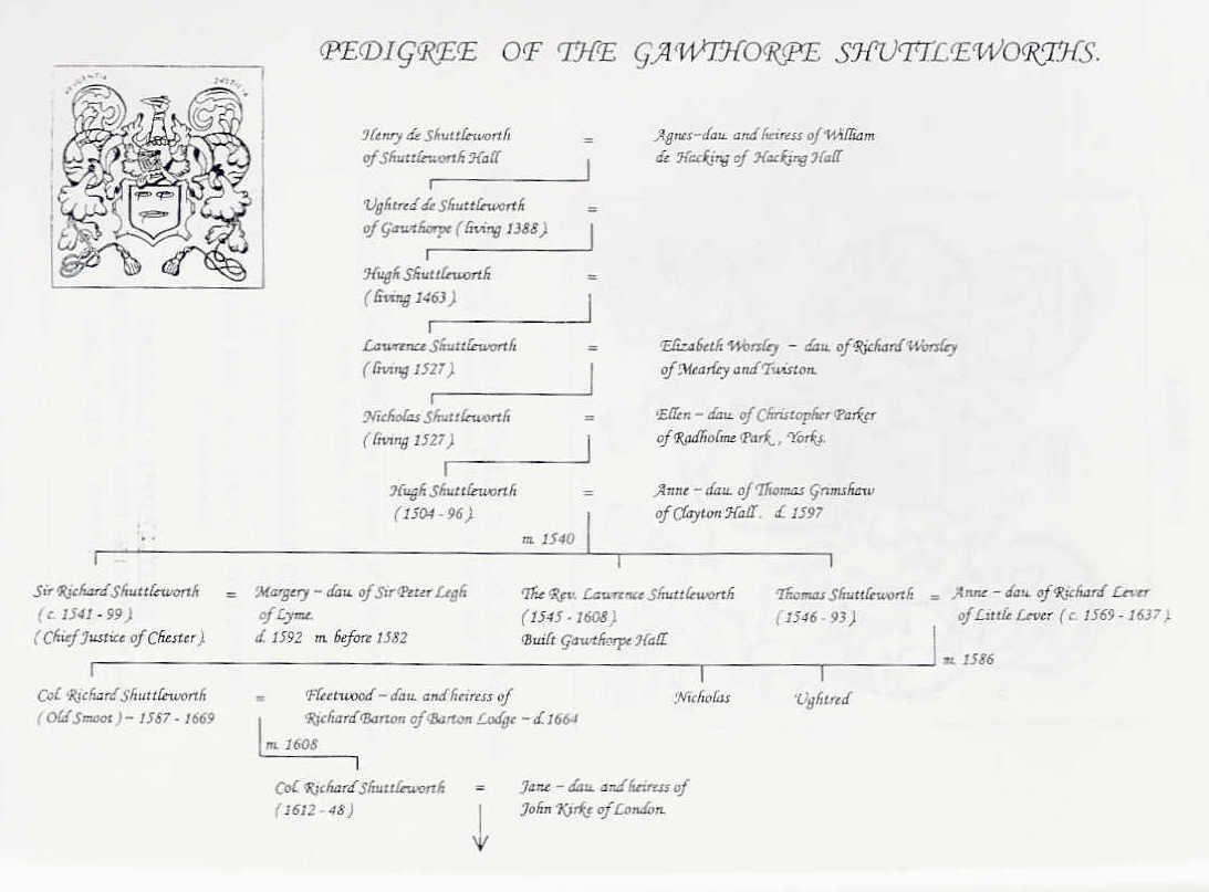 During his visitation the King would probably meet the local gentry which included Henry de Shuttleworth from neighbouring Shuttleworth Hall (see page 65) whose son, Henry married Agnes the heiress of William de Hacking of Hacking Hall. (fig 1). It was Ughtred, one of their younger sons, who was the first Shuttleworth of Gawthorpe (fig 23). He arrived there during the period when John of Gaunt was Duke of Lancaster and, consequently the owner of the Manor of Ightenhill.