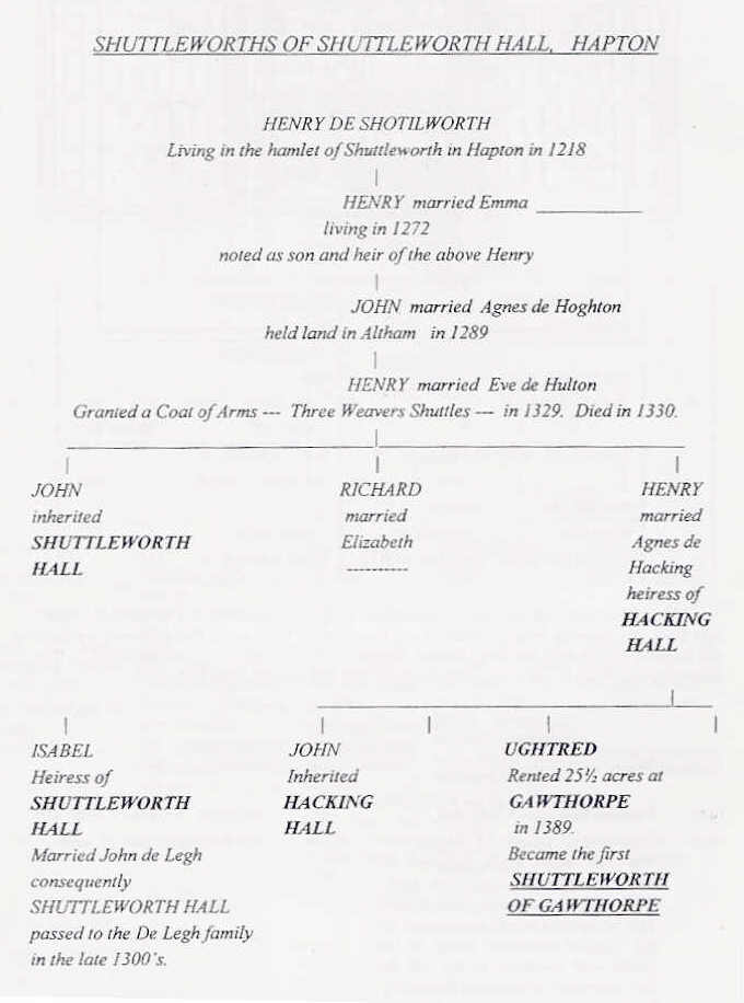 The earliest known Shuttleworth was a Henry, who was living at Hapton in 1218. Conroy1 (p. 65) presents a descendant chart for “Henry de Shotilworth” (Figure 5a,) which extends for six generations and shows Ughtred as the “first Shuttleworth of Gawthorpe.”