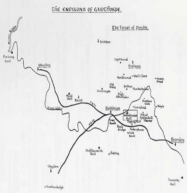 Figure 3. “The Environs of Gawthorpe,” showing the location of Gawthorpe near Padiham. Note also the locations of Shuttleworth Hall and Clayton (Hall) to the southwest of Gawthorpe Hall. From Conroy1, Fig. 2.