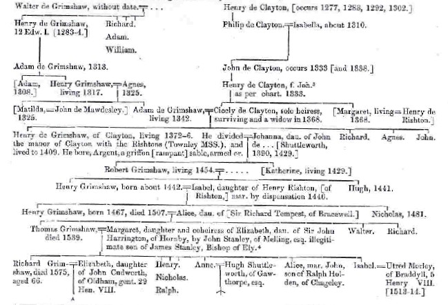 Anne Grimshaw was the fifth child of Thomas and Margaret (Harrington) Grimshaw of Clayton Hall. In 1540 she married Hugh Shuttleworth of Gawthorpe, located about four miles northeast of Clayton Hall. The descendants of Hugh and Anne (Grimshaw) Shuttleworth comprise one of the more distinguished family lines of Lancashire. Gawthorpe Hall, a significant historical landmark in the region, was built by the sons of Hugh and Anne between 1600 and 1604.