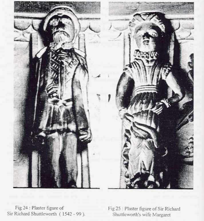 Lawrence’s son Nicholas married Ellen Parker of Bowland daughter of Christopher Parker of Radholme Park in Bolland (Bowland), another notable t3mily in the area. (It was her cousin, Edmund, who built Browsholme Hall in 1507 where the Parkers still reside.). Nicholas’s date on the plaque is 1473. He it was who covenanted with the Towneleys and others for the rebuilding of Burnley parish church in 1532. Their son, Hugh was twenty-eight by this time having been born in 1504. He married Anne Grimshaw of Clayton Hall in 1540. The Grimshaws held the manor of Clayton and had important connections, Anne’s mother Margaret being a member of the Stanley family. Hugh and Anne had three sons, Richard born 1542, Lawrence born 1545 and Thomas born about 1546. Hugh Shuttleworth was now affluent enough to provide 28 soldiers in the muster of 1574. In the next decade his son, Richard received the honour of Knighthood, probably when he was elevated in the judicial bench. In 1580 the Shuttleworths acquired the lease of Ightenhill Manor Park, some 690 acres to the east of Gawthorpe (the Manor House by then in ruins and had been since the 1500’s). Now the family had control of most of the land in the Padiham, Simonstone, Higham, Ightenhill and Habergham area. Thus the Towneleys and Shuttleworths were the most influential gentry in the area at this time, so much so that they were ‘chosen’ by Queen Elizabeth to lend money to the crown in the year of the Armada 1588, and again in 1597.