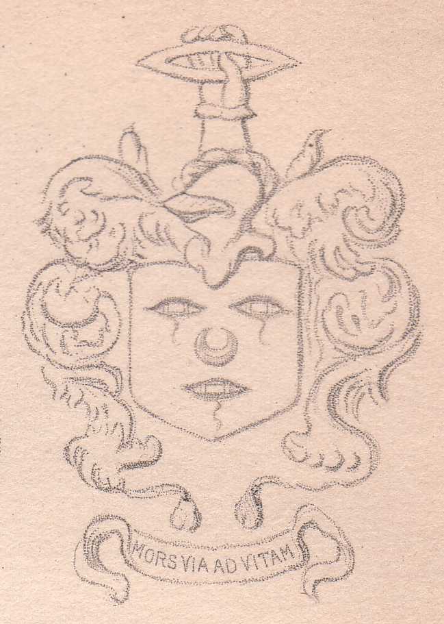 Crest. On a wreath of the colours a cubit arm in armour, the hand in a gauntlet proper grasping a shuttle, as in the arms.