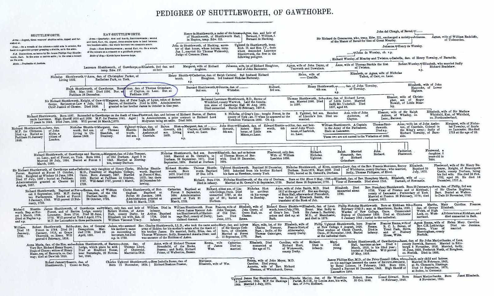 Figure 13. Whitaker’s Descendant Chart for the Shuttleworth family, with Anne Grimshaw shown in blue circle.