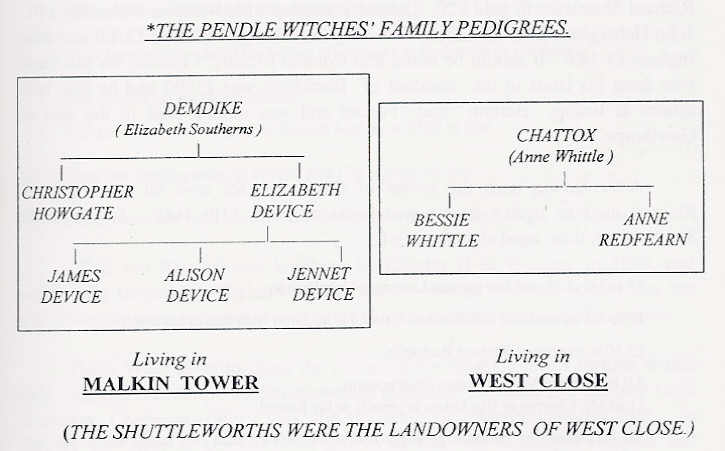 The unfortunate story of the Pendle witches, in which seven people (six women and one man) were put to death by hanging in 1612, is described in a companion webpage. The person who accused the women of being witches was Robert Nutter, the servant of Sir Richard Shuttleworth (oldest son of Hugh and Anne.) The accused witches, Chattox (Anne Whittle) and her daughter, Anne Redfearn, lived in West Close, which was owned by the Shuttleworths of Gawthorpe. The following excerpt from Conroy1 descirbes the events and connections. Figure 12 shows the pedigrees of the Pendle witches.