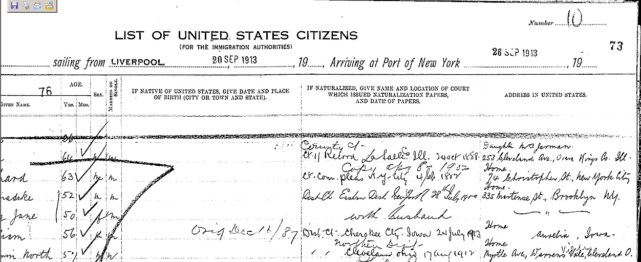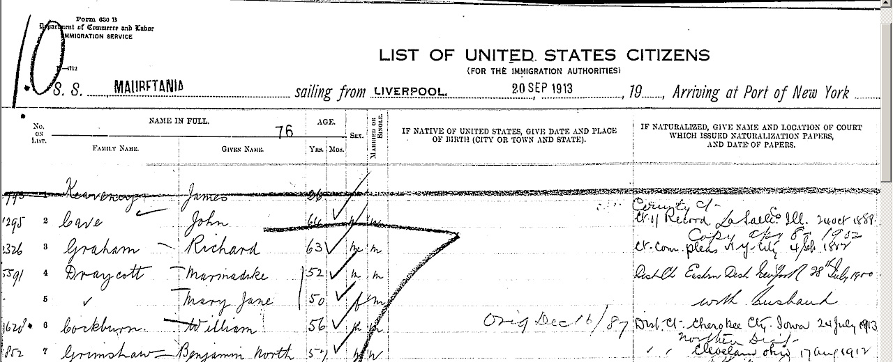 The 1913 ship manifest found 57-year-old Benjamin (he was closer to the truth of his age by 4 years) arriving on the Mauretania from Liverpool on September 26. His address was Myrtle Avenue, Warrens Vale, Cleveland, Ohio. He had been naturalized by the District Court, Northern District, Cleveland on August 17, 1912. Harriet Grimshaw arrived two months later, on November 28, on the Lusitania from Liverpool. She was from Shipley and was arriving to join her husband on Myrtle Avenue in Warrensville, Ohio.