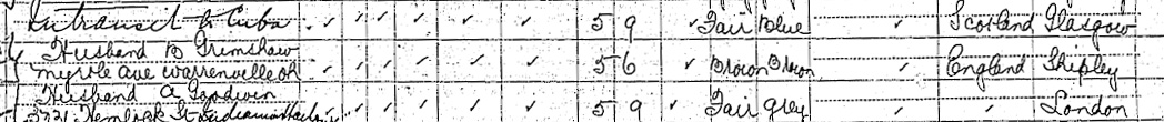 Roger Grimshaw called the website author in 2001 indicating he was a descendant of Benjamin North Grimshaw, who immigrated to Cleveland, Ohio, but no further information has been received. Immigration records on the Ellis Island website (see below) indicate that Benjamin arrived in the U.S. in 1904 from Shipley, which is in Yorkshire. Benjamin subsequently arrived in September 1913 (he was living in Cleveland by then) and was followed by his wife, Harriet, in November 1913.
