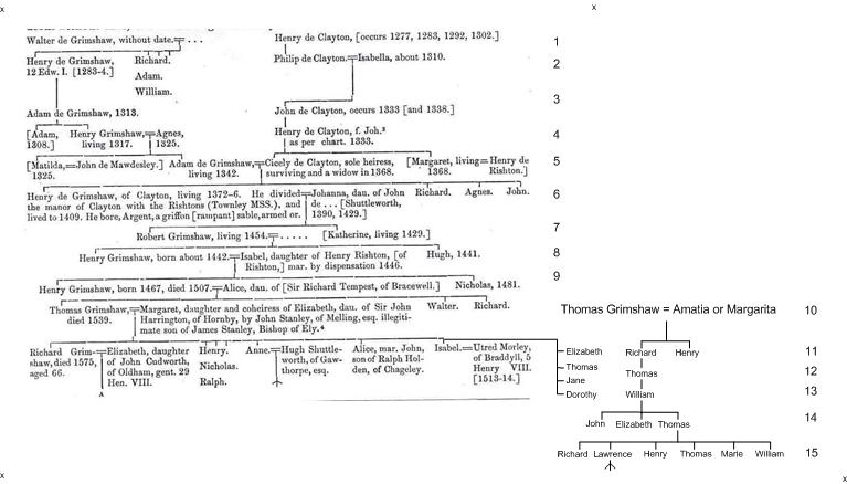 |–|–|–|–|–|–|–|–|–10. Thomas Grimshaw*, d. 1539, (succeeded father 1506), had two illegitimate sons by Amatia or Margareta.