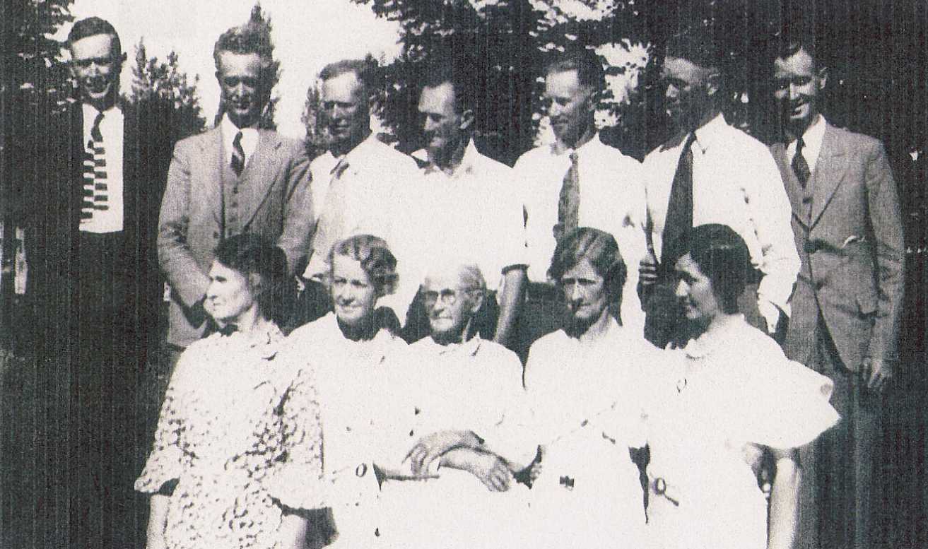 Figure 5. Duckworth and Mary Jane Grimshaw’s family. Back row, left to right: John, Will, Ray, Lawrence, Arnold, Dolph, George W. Front row, left to right: Elizabeth, Jane, Mary Jane (mother), Ida, May