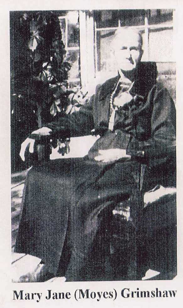 Mary Jane Moyes Grimshaw, daughter of William and Mary Eastcott Moyes, was born June 6, 1850, at Pratterson River, New South Wales, Australia. When she was six years old she left Australia with her parents to come to America. They were eleven weeks on the sea in a sailing vessel and during this time, she, with the other six children, had whooping cough. They arrived in San Bernardino, California, in August 1856, and stayed there one year where William raised a crop before crossing the great desert to Utah. I have heard Mother fell many times of the heartaches that came when she had to part with her playthings and the little treasures that were so dear to her childish heart. Day after day the oxen grew so weary they were forced to abandon everything but the bare necessities of life. They arrived in Beaver, Utah, February 15, 1858, just two years after the first settlers. That night the snow fell a foot deep and the only shelter for nine was a wagon box. They were poor people in those early days and had many hardships and struggles; even the children had to work hard. Mother used to go barefoot over the rough rocks and brush east of Beaver to herd sheep with her little-brother, and often their feet were sore and breeding from the thorns along the way. Many times their lunch was dry bread which they dipped in water and sprinkled with salt; sometimes the bread was black and bitter from sunflower seeds which were ground up with the wheat, as there was no way of separating it. Only extreme hunger could induce them to cat it.