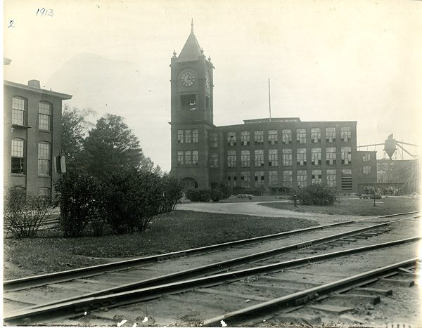 “Mill no. 8. A 1913 view of the upper mill yard looking northeast toward no. 8 mill. The clock tower in the photograph is part of the Ludlow Town seal and is still standing but not working today. The railroad shown in the forefront of the photograph is the Boston and Albany Railroad. Photographer noted the trees and shrubbery.”