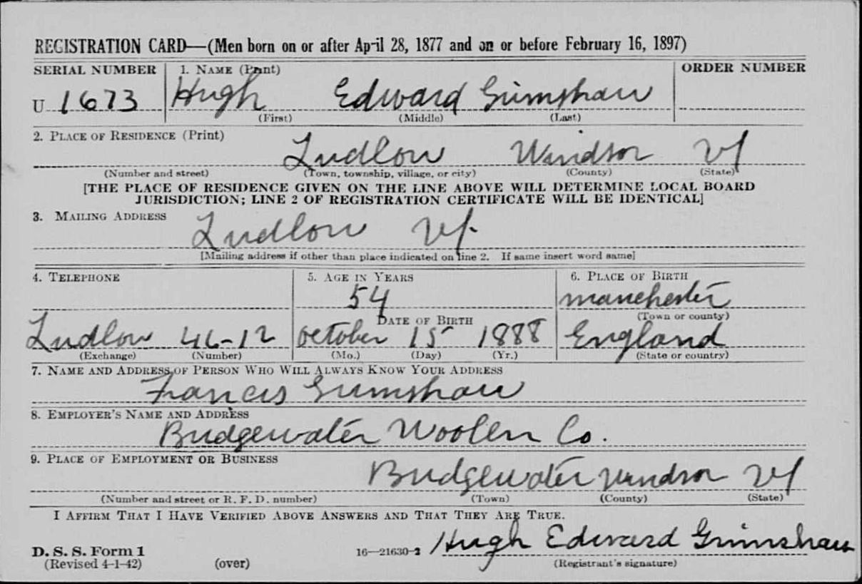 Note the 1886 birthdate on WWI, which changed to 1888 on WWII card. Other records indicate that 1886 is the correct date, based on when Edward and Mary Ann Grimshaw immigrated to Vermont.
