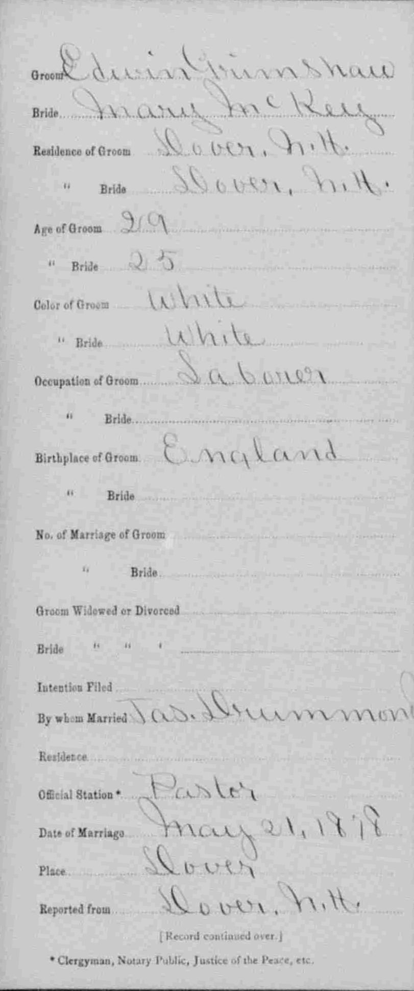 Edward or Edwin Grimshaw (ca 1849, England – ?) & Mary McKee (ca 1853, Ireland – ?). Married May 21, 1878 in Dover, NH.