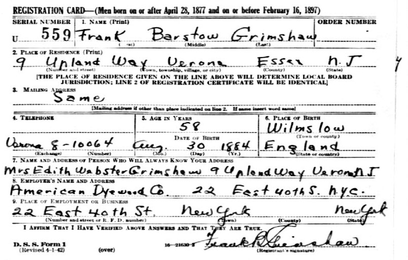 From Frank’s registration card, shown below, it may be determined that he was married to Edith (Webster) Grimshaw, and that he lived in Essex, New Jersey and worked in New York City.