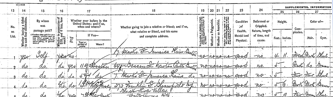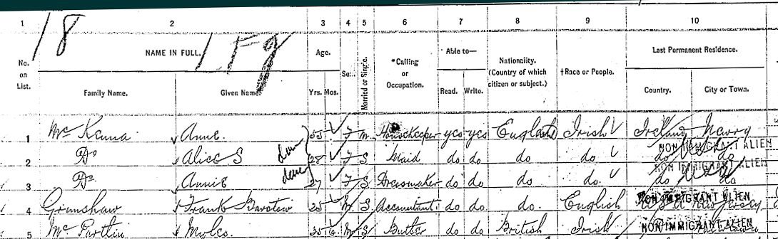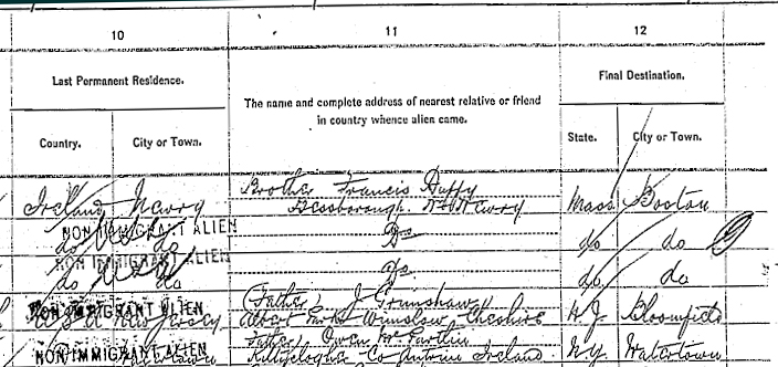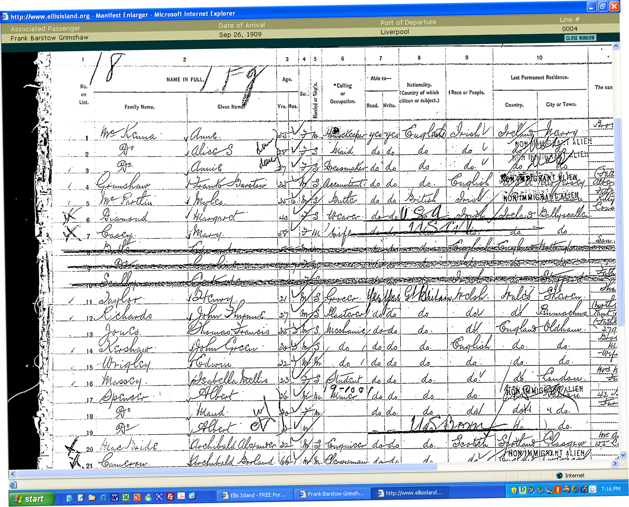 Ellis Island 1909 Arrival Record for Frank Grimshaw