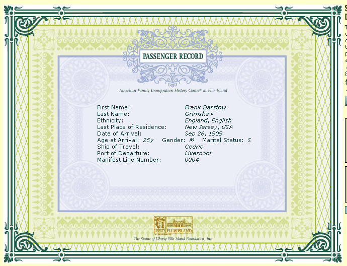 Ellis Island 1909 Arrival Record for Frank Grimshaw