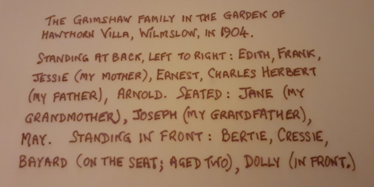 An excellent photo of Frank Grimshaw’s parents and family – with identifications – was provided by Lizzie Clark in January 2020. The two images are shown below. As indicated in the identifications, Frank is in the upper left portion of the photo.