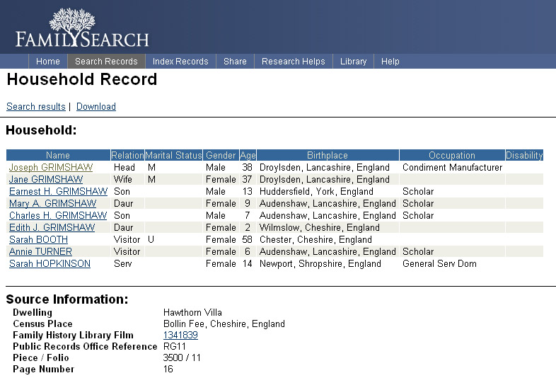 1881 British Census Record of Frank Grimshaw’s Family of Origin