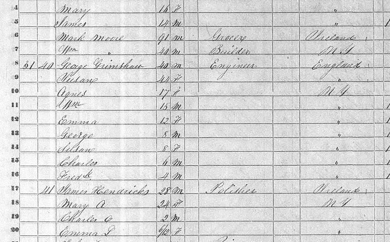 29. 1870 US Census Records- Manhattan, New York- http://tomwgrim.home.texas.net/WebPages/1870Census.htm, 22-wd, 14 Ed, Vol 1013 page 482- Film, Grimshaw, George2 m w NY.