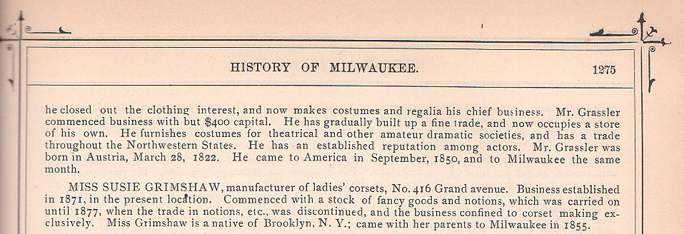 4. Re: (Prussia)Re: WI State Historical Society, E-mail from Aharsh@tds.Net, Miss Susie Grimshaw-manufacturer of ladies’corsets, NO 416 Grand Ave. Business established in 1871 in the present location. Commenced with a stock of fancy goods and notions, which was carried on until 1877, when the trade in notions, etc was discontinued, and the business confined to corset making exclusively. Miss Grimshaw is a native of Brooklyn, New York, came with her parents to Mmmilwaukeein 1855.