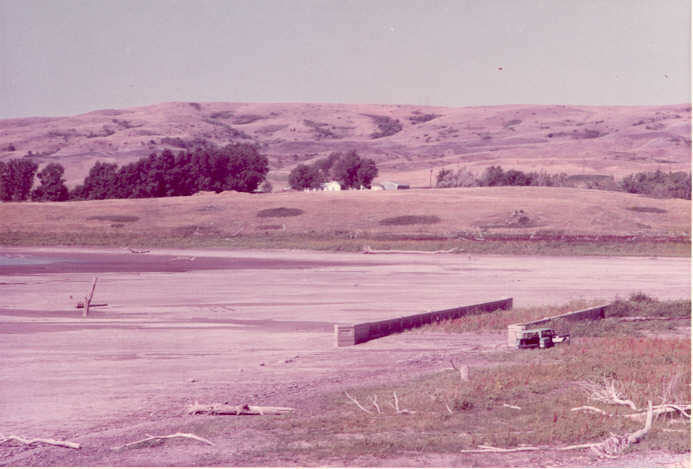 American Crow Creek formerly flowed from right to left (north to south) under the bridge, but when Lake Francis Case was created by Fort Randall Dam in the 1950s, the creek “silted” up at this location, about a mile upstream of the former confluence with the Missouri. Highway 16 was relocated further to the north in anticipation of the inundation. The shore of the lake can be seen at the left of the photo, which was taken in about 1972, during a time of lower lake levels.