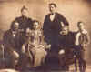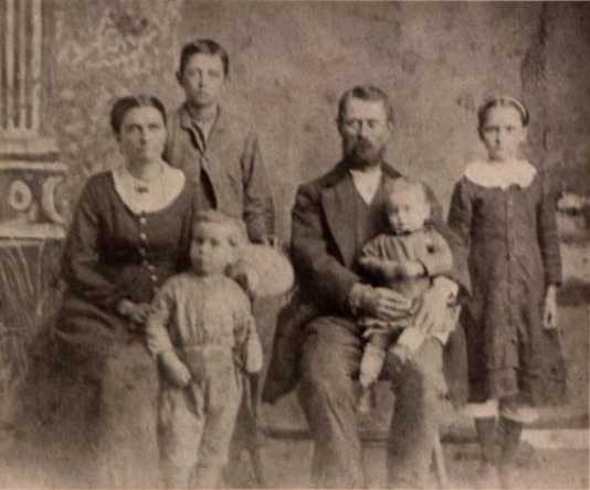 Group Photo of George and Aris (Ladd) Grimshaw and their first four children. From left to right: Aris, William Allen (older boy, standing), Wallace J., George, Mary Evelyn (“Eva” – young child in George’s lap), and Anna Celestine (“Tina”). (Photo courtesy of Carol Anderson, March 2002. Photo taken in 1883.)
