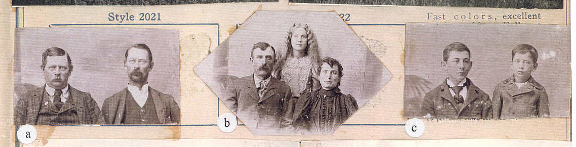 The photo “album” is actually a catalogue of men’s shirts on whose pages the photos have been glued. It seems apparent that the photos were not well sorted before being glued into the album. One has the impression that a box of photos existed and someone (probably Nettie) decided to put them into the catalogue, perhaps for better presentation. Dorothy indicated that Doc was in the clothing sales business at one time, and it is likely that Bill and Nettie got the catalogue from him
