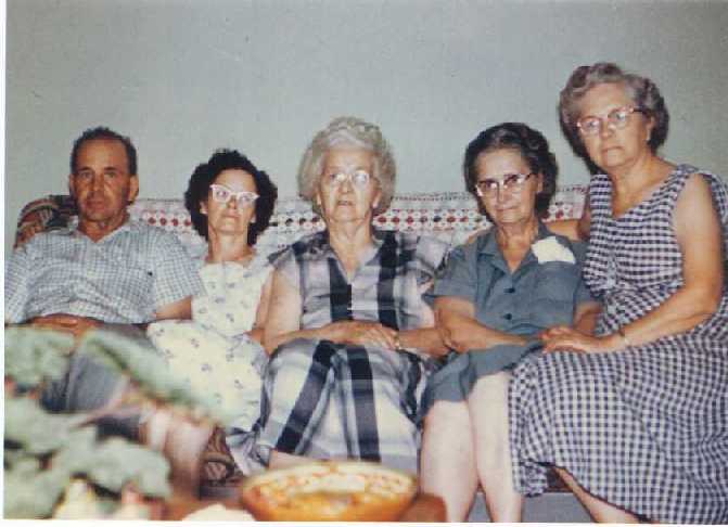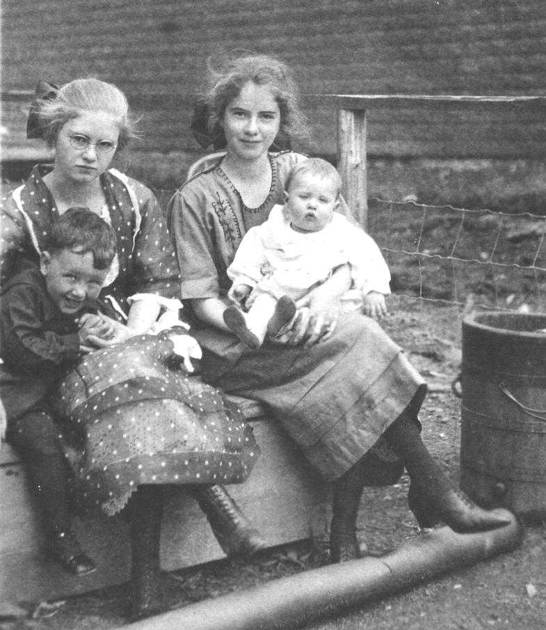 Tina outlived George by 42 years (she was about 17 years younger than he) and apparently lived in the area around Oacoma, Reliance and Chamberlain for the remainder of her life. A photo of their daughters Georgia and Elsie with their cousins (sons of Walter Claude and Freda Grimshaw) is shown below. A picture of Tina in her later years, with most of her daughters, is also shown below. Tina and George are buried together in the Oacoma cemetery.