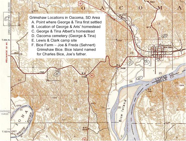 In 1902 George and Tina Albert moved to Oacoma, apparently at least in part to make homestead claims. Initially, however, they settled at a location on American Crow Creek southwest of Oacoma, and were apparently joined soon after by George and Aris and the rest of the Grimshaw family, whose place was just across the creek to the west. A couple of versions of previously published histories of Oacoma and of Lyman County are given below on this website as context for Grimshaw family history.