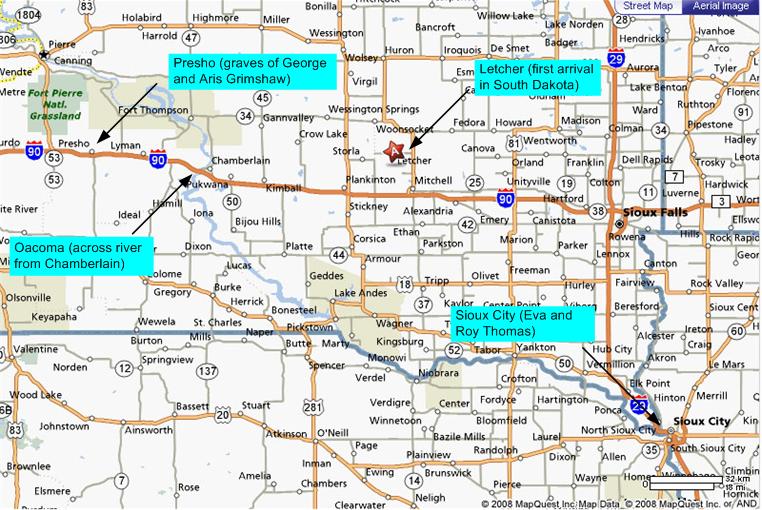 Map of central and southeastern South Dakota, showing Letcher, where George and Aris first settled, Oacoma, where they subsequently moved to, and Presho, where they are buried. Also shown is Sioux City, where Roy and Eva (Grimshaw) Thomas lived and are buried.