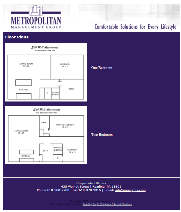 The Grimshaw Silk Mill in Reading, Pennslyvania is described in depth on a companion webpage. This webpage provides additional photos of the Silk Mill Apartments, which comprise the former Grimshaw Silk Mill. Both outside and inside photos are provided, as well as floorplans for the one- and two-bedroom apartments.