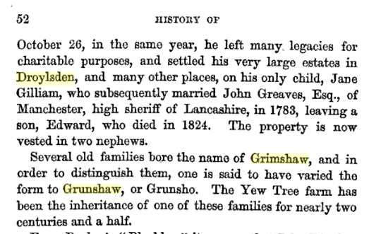 The name “Grunshaw” is almost certainly derived from the original Grimshaw surname – sometimes apparently by choice of Grimshaws seeking an alternate name if they were living in an area (like Manchester and its surroundings) where Grimshaw was a very common name, and sometimes by errors in documents such as passenger lists.