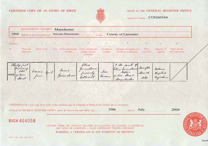 Emma J Grimshaw Birth Certificate, Added July 15, 2004
