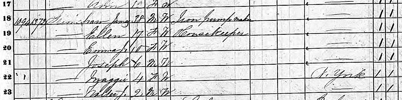 The 1870 U.S. Census (see Figures 2a and 2b below) found James living with five of his children in the 8th Ward of Brooklyn. This record indicates that Ellen was not with the family, nor was the third child, Halton (twin of Margurite or “Maggie”?). A younger brother of Marguerite, Walter, is also indicated as living with the family.