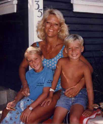 Karrin Marie Tollin with sons, Wesley Jared Harding, and Whitney Ryer Harding, in front of Win’s house in Long Beach, CA (ca. 1986)