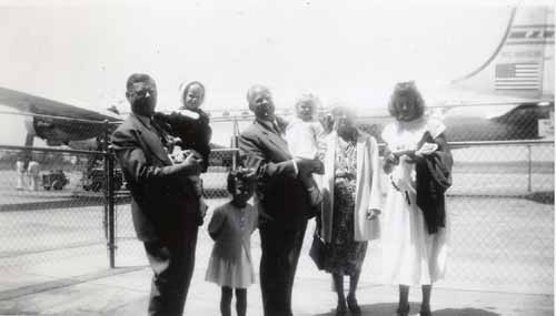 I’m attaching another picture, VA, holding my cousin Jackie, I think, my Dad, Albin Tollin, holding me I think, VA’s wife, Ella Herbert, and my Mom, Winifred Herbert Tollin. Oh, and that’s my cute sister smiling in the fore ground. Evidently Vee, came back from Hawaii, not pictured. Check out the airport, and the chain link fence! I’m positive it was LAX!!! No security, remember those days!